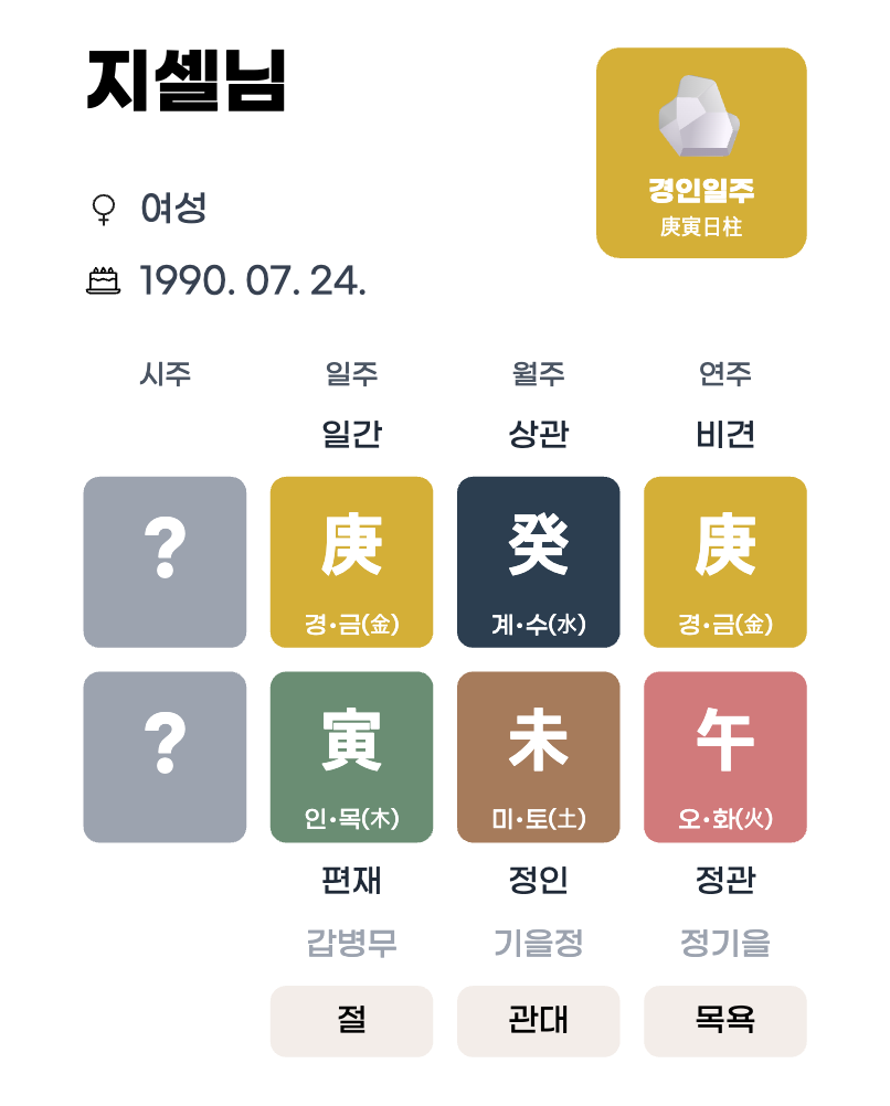 지셀님의 일주는 경금(庚)일간 위에 인목(寅)이 놓인 구조예요.